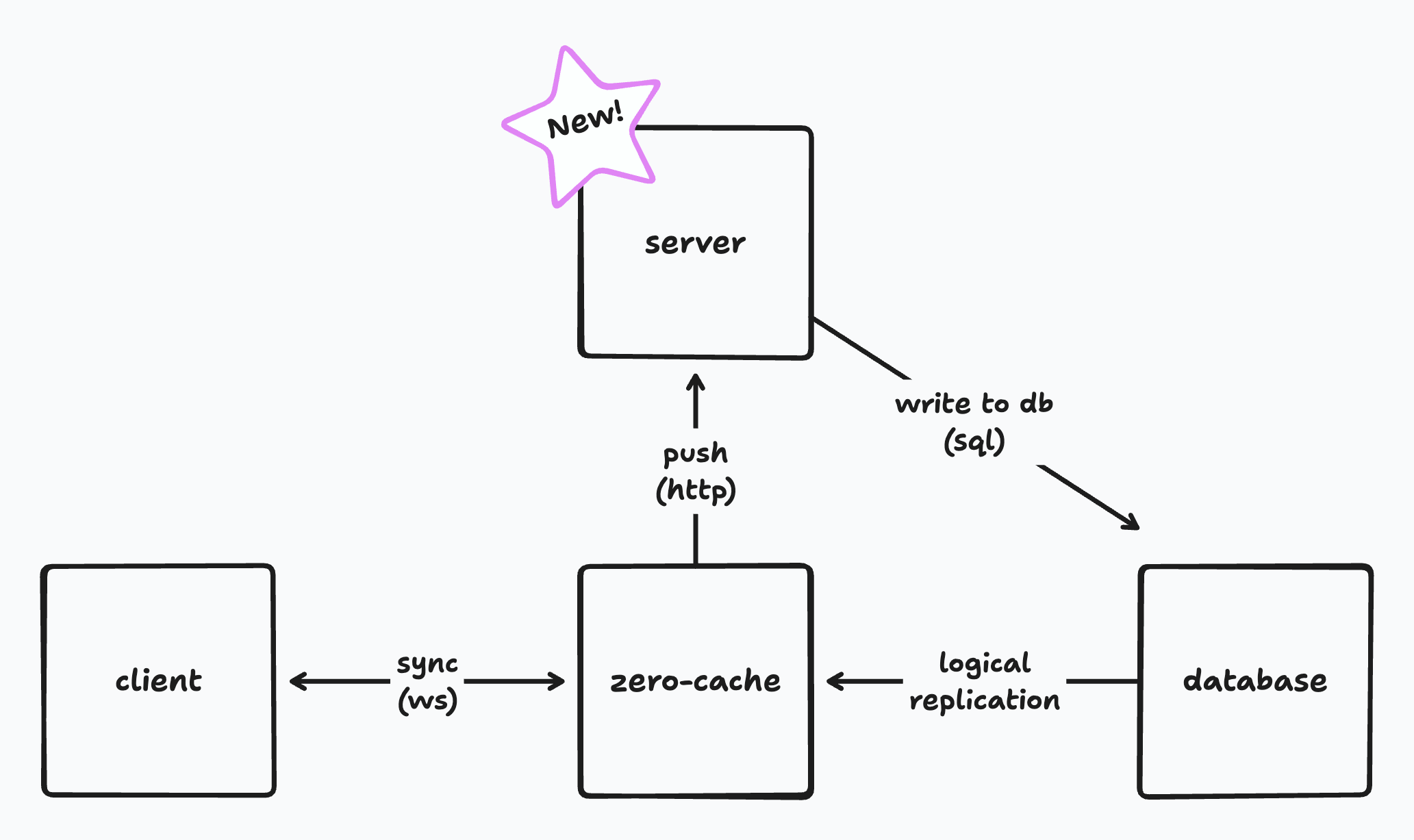 The server can be a serverless function, a microservice, or a full stateful server. The only real requirement is that it expose a special push endpoint that zero-cache can call to process mutations. This endpoint implements the push protocol and contains your custom logic for each mutation.